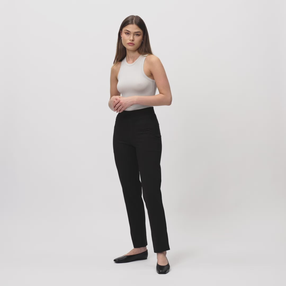 Asana Slim Pant, peach-soft, slim ankle-length trousers blending tailored style with loungewear comfort. For an ankle fit, choose a length 2" or 4" shorter than your relaxed pants. Featuring discrete zip pockets, a high centrefold waist, and a brushed activewear knit, they're ideal for your everyday, work, travel, and lounging.