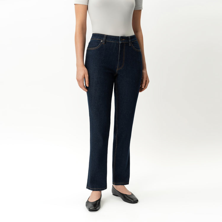 Experience the classic look of denim with the comfort of incredible stretch. Our high-waisted, straight-leg slim jeans are crafted from a proprietary denim blend that’s both very stretchy and thick, providing the feel of traditional denim with added flexibility. Versatile and perfect for everyday wear, these jeans are a must-have in your wardrobe.