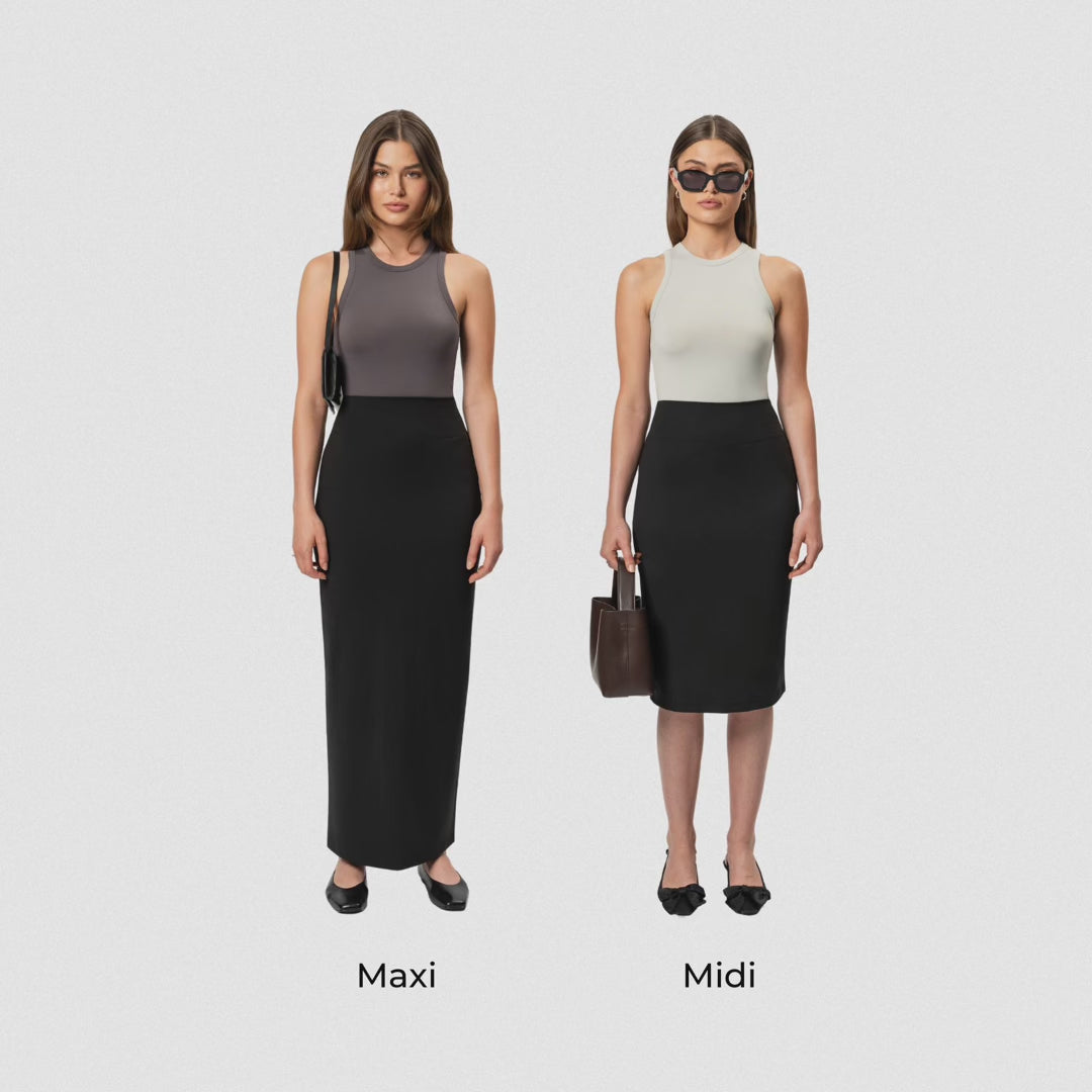 This full-length maxi skirt boasts a sophisticated aesthetic with the comforts of activewear. Its high-waisted, pencil silhouette and subtle middle back slit promise ease of movement while making a style statement.