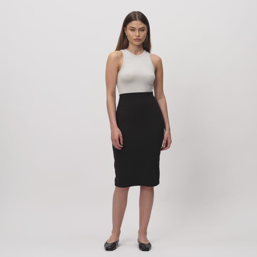 This midi skirt boasts a sophisticated aesthetic with the comforts of activewear. Its high-waisted, pencil silhouette and subtle middle back slit promise ease of movement while making a style statement.