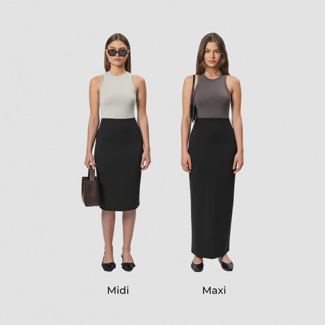 Discover the perfect blend of sophistication and comfort with our midi skirt. The high-waisted, pencil silhouette and middle back slit provide both style and ease of movement, making it ideal for any occasion.